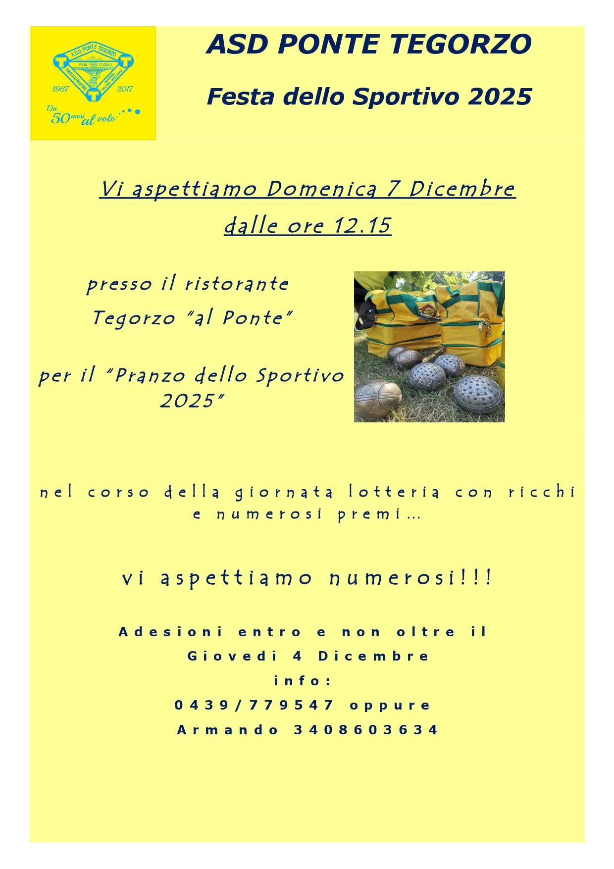 Quando? il 7 dicembre dalle 12.15 vieni a festeggiare con noi al pranzo della tradizionale festa dello sportivo.